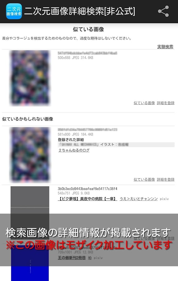 三次元画像詳細検索 japimage.blogspot.com 2017 09 01 ネット暦の長い人なら、ネットサーフィン中に思わず保存したくなるようなセクシー画像を見つけても、写っている人が誰だかわからなかったという経験が一度はあるハズだ。また、かつて自分が保存した画像でも、「アレっ!? このキャラ名前なん  2017 03 03 画像を指定すると似たような画像を探し出してくれる「類似画像検索」サイトをいくつか紹介。 ある画像と似ている 似た色の画像を探してくれるものや、手書きで描いた絵を元に画像を探してくれるサイトなどがあります。 以下に合計10サイトを  二次元画像詳細検索」サイトの非公式アプリです。 画像を元に類似画像と画像に関する詳細情報を検索するアプリです。 ※二次元イラストに特化した画像検索を行います。実写(三次元)画像は検索出来ません。 以下の事が出来ます。 ◯ローカル画像からの